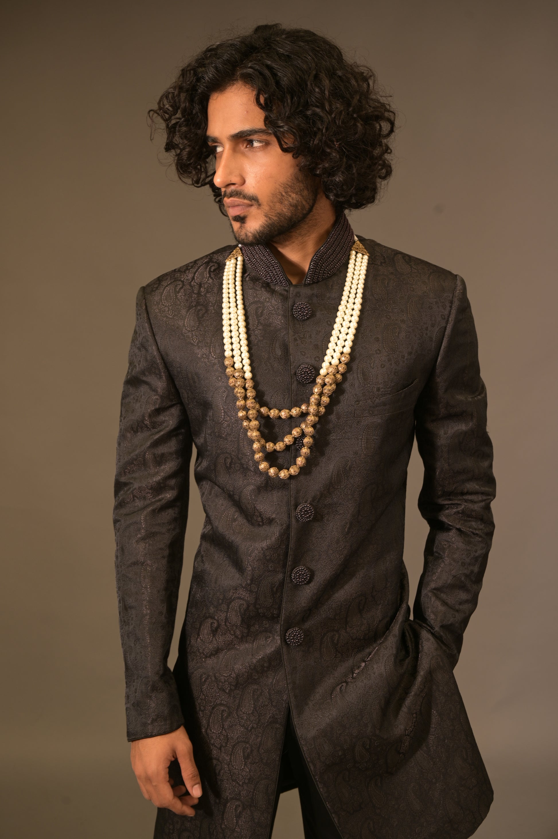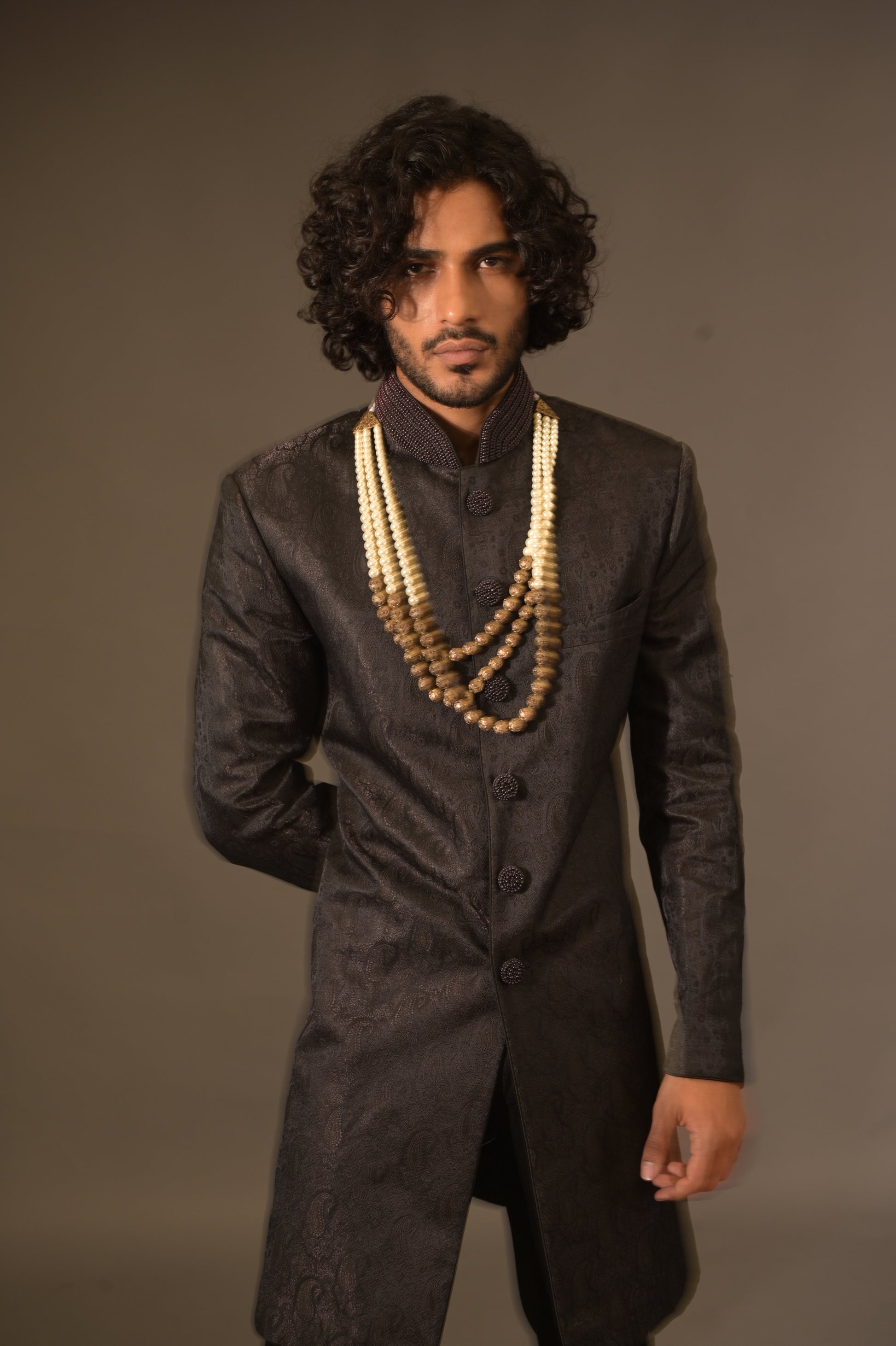 Crafted from luxurious black silk with intricate brocade detailing, the Black Sherwani exudes sophistication and elegance. Paired with trousers