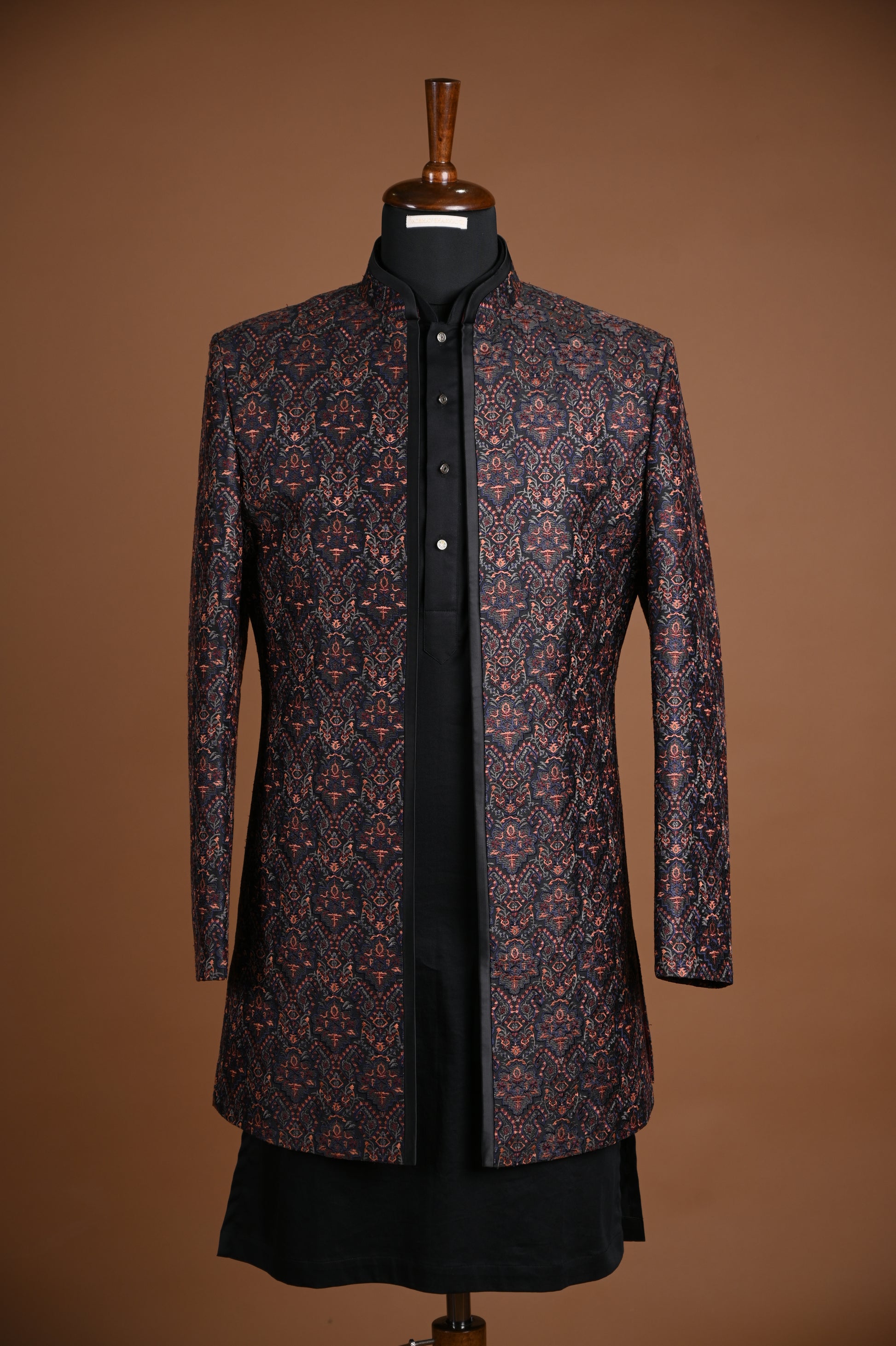 front open all over resham embroidered Indo jacket, paired with kurta and pyjama.