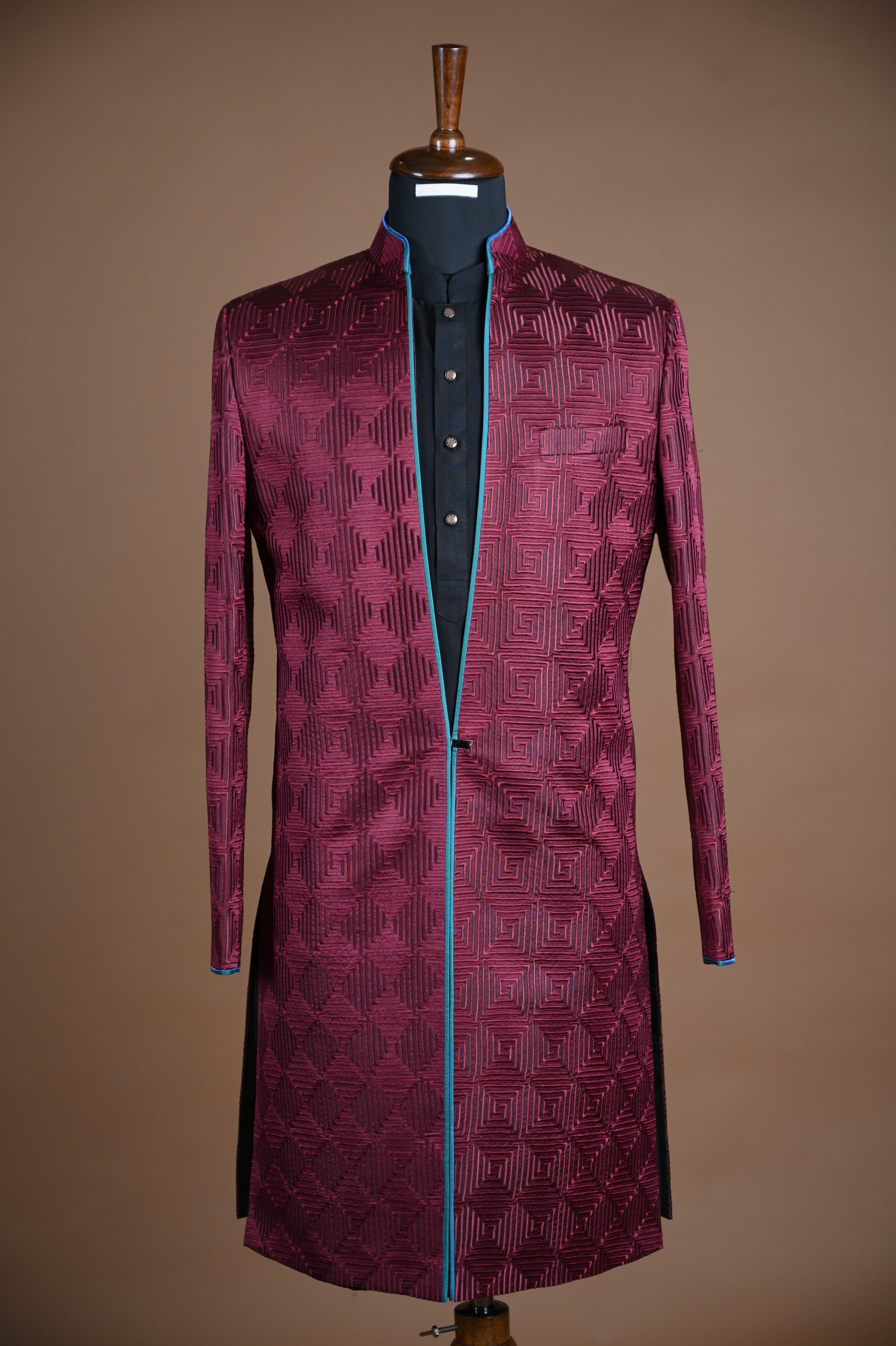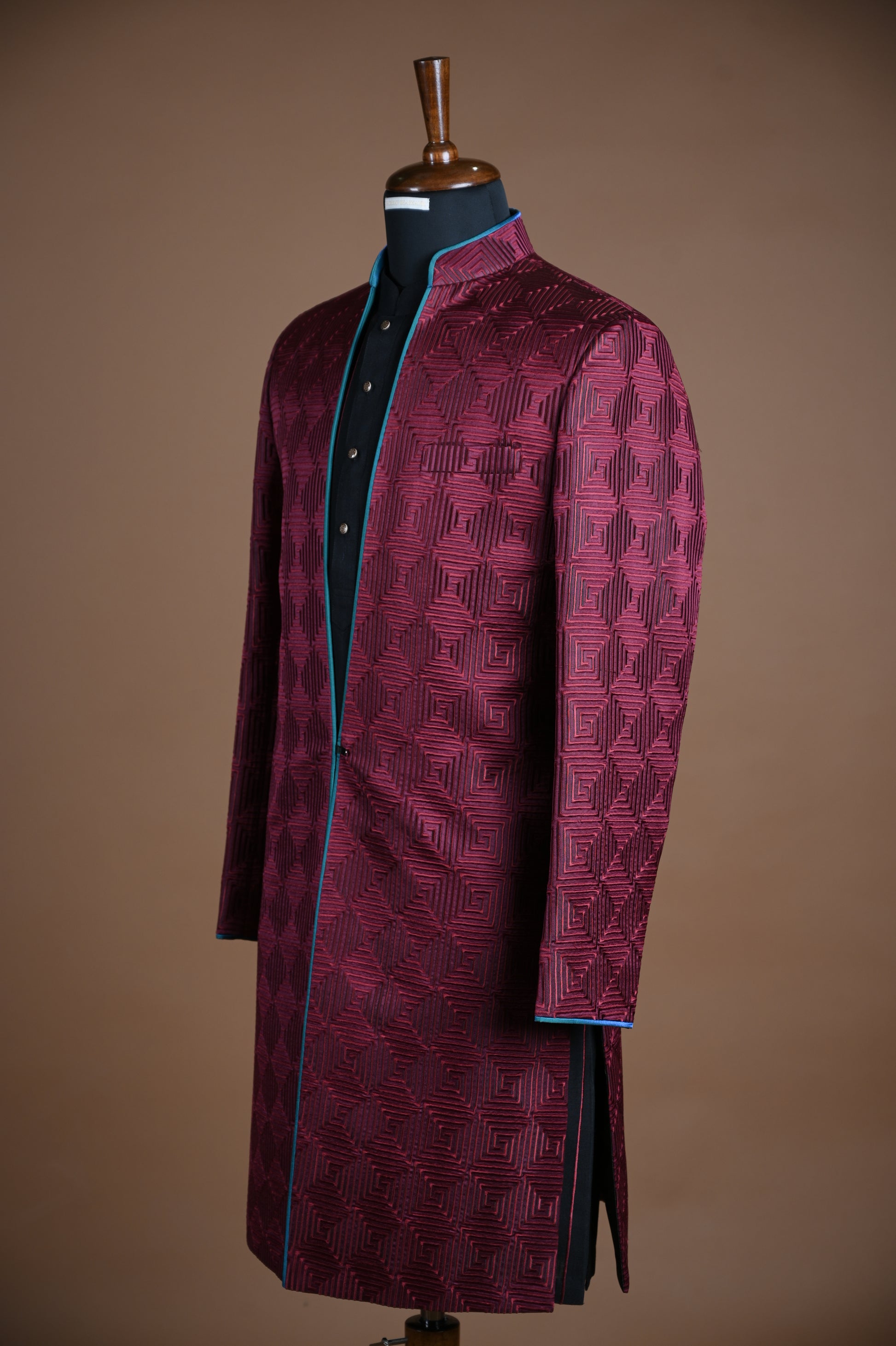 Optical illusion resham embroidered Indo jacket with emb. kurta and pyjama.