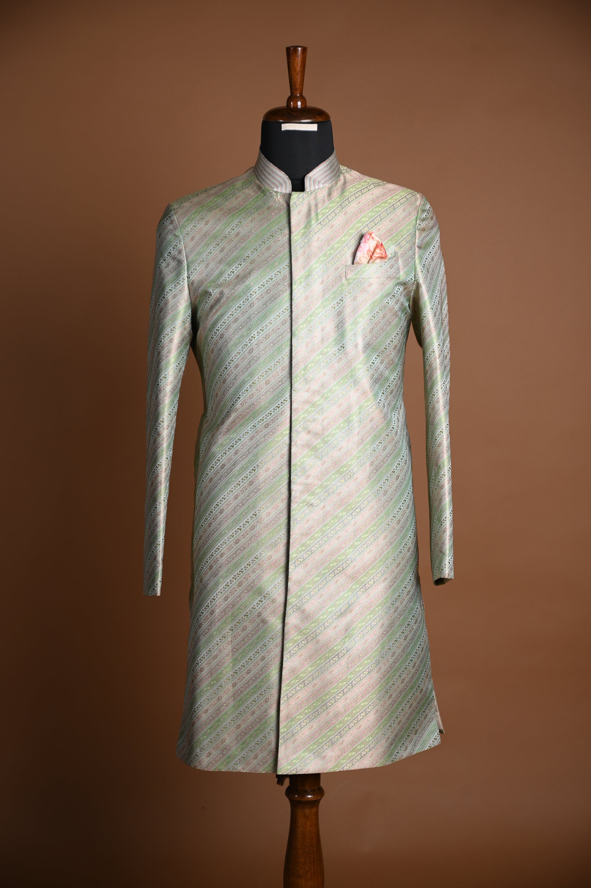 FRONT OPENMULTI-COLOUR BROCADE SHERWANI STYLE KURTA PAIRED WITH PYJAMA